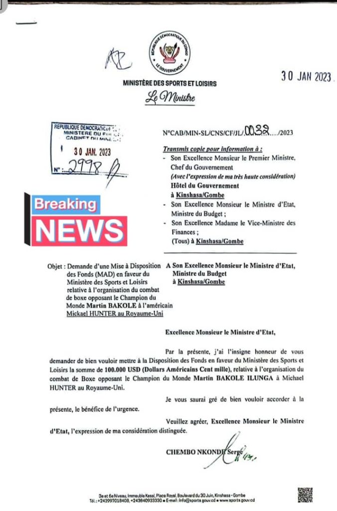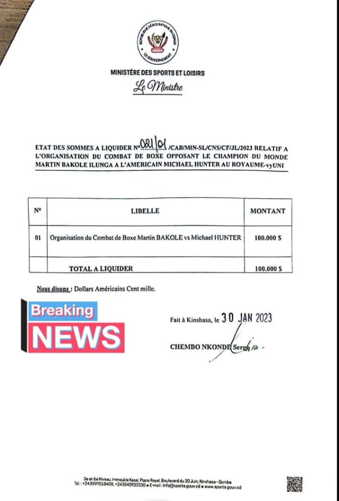 Le ministère des Sports et Loisirs de la RDC demande au gouvernement de mettre à sa disposition 100.000 $ pour l’organisation du combat de boxe qui va opposer le champion Congolais Martin Bakole à l’américain Michael Hunter au Royaume Uni.