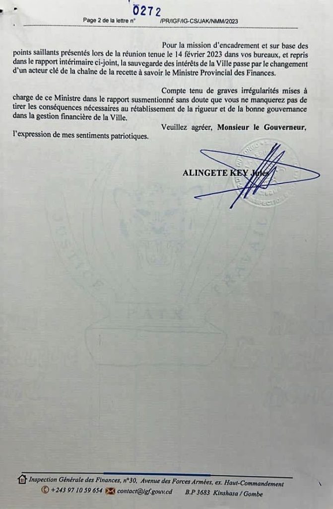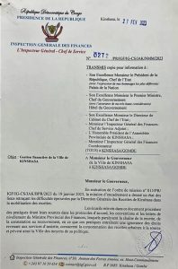L’inspection Générale des Finances ( IGF) a mené une mission d’encadrement de la gestion des finances de Kinshasa, la capitale de la RDC, de janvier à février 2023. Parmi les recommandations formulées au terme de cette mission, l’IGF demande au gouverneur Gentiny Ngobila de limoger son ministre des Finances qui brille par beaucoup de légèretés dans la tâche qui est sienne.