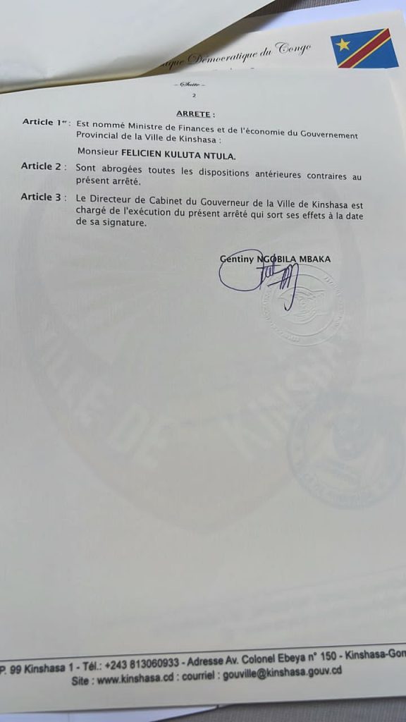 Le gouverneur de la ville province de Kinshasa, Gentiny Ngobila Mbaka, vient de nommer, par voie d’arrêté, un nouveau ministre des Finances. Il s’agit notamment de Félicien Kutula Ntula.