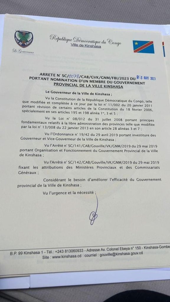 Rappelons que cette nomination intervient quelques jours après la recommandation de l’Inspection Générale des Finances ( IGF) qui demandait au gouverneur de la ville de Kinshasa de nommer un nouveau ministre des Finances, en replacement à Jean Ngoy Mvuzi.