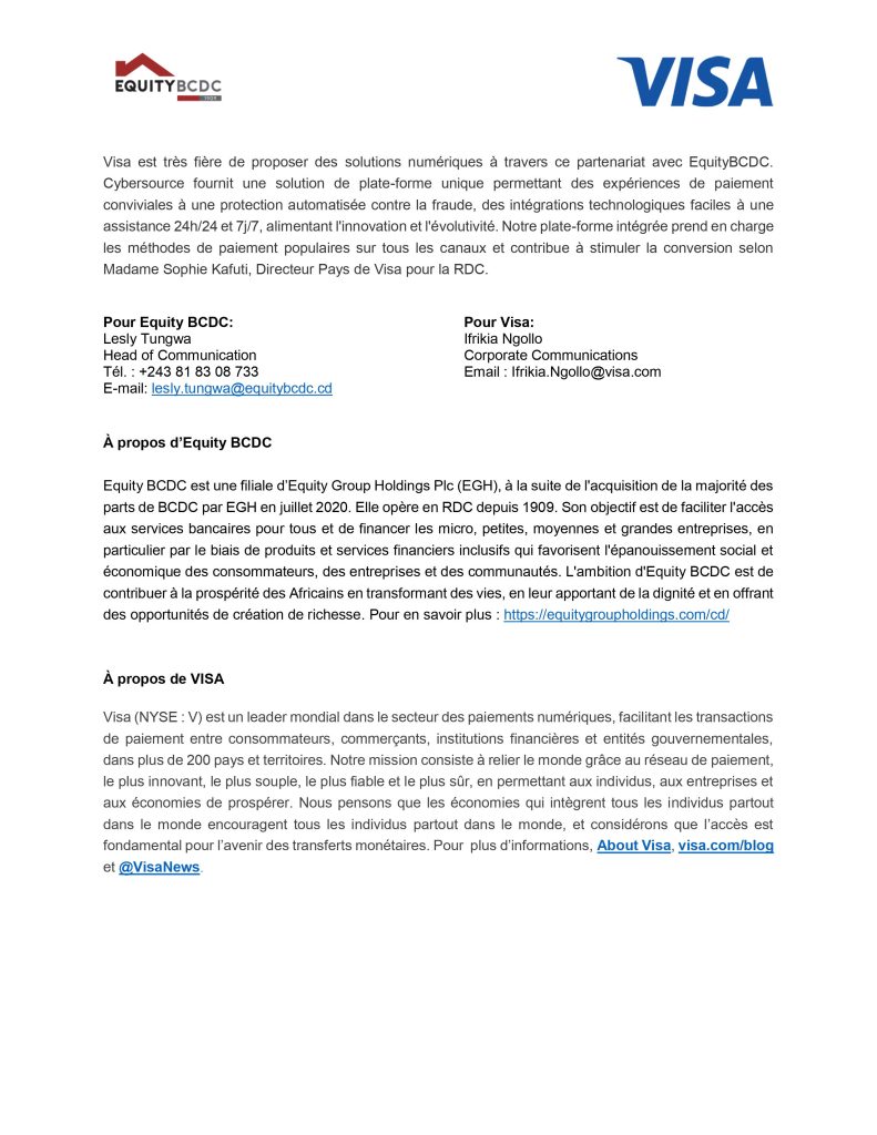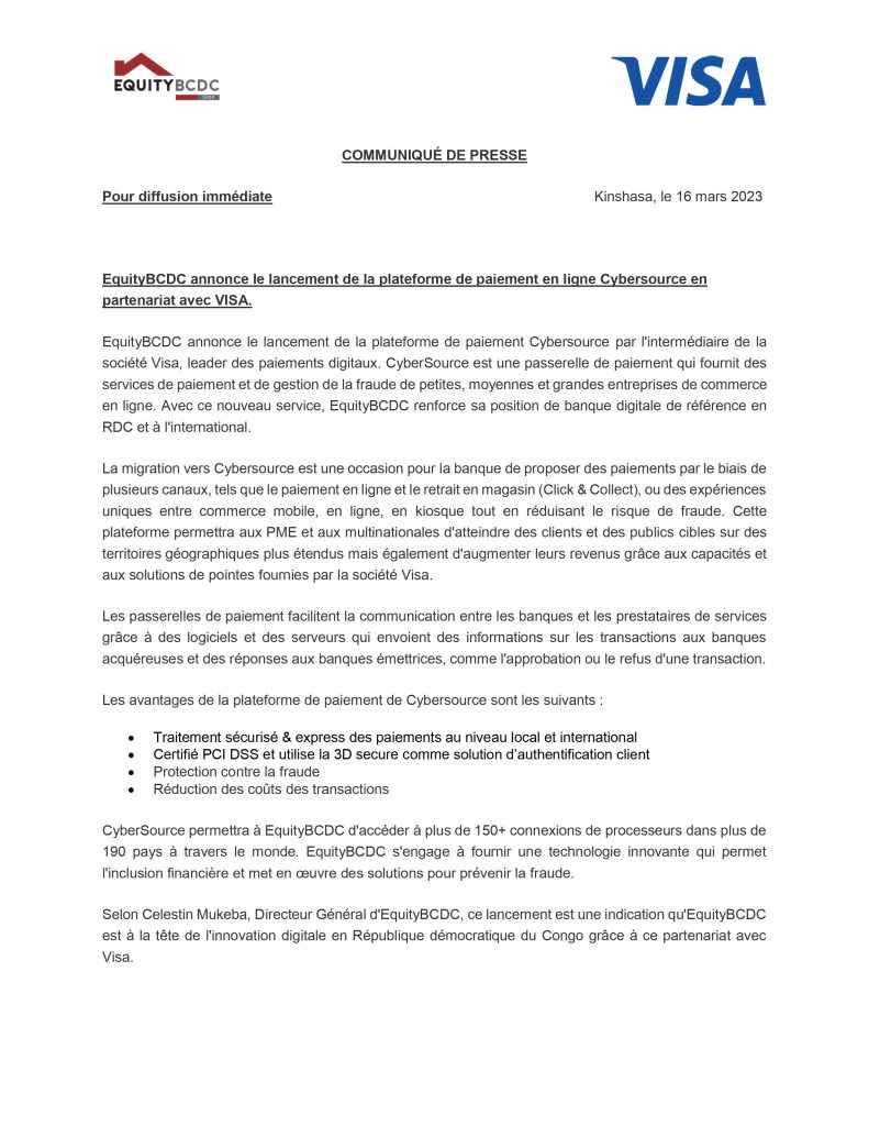 RDC : EquityBCDC annonce le lancement de la plateforme de paiement en ligne Cybersource en partenariat avec Visa