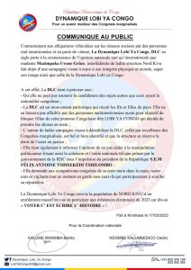 Dans un communiqué parvenu à notre rédaction ce vendredi 17 mars 2023, signé conjointement par Ndombe Kalumbedico Cédric et Kalume Mwamba Benito, membres de la coordination de cette structure qui se dit le reflet des congolais marginalisés, la DLC dit connaître l’auteur de cette campagne et se réserve le droit de l’ester en justice.