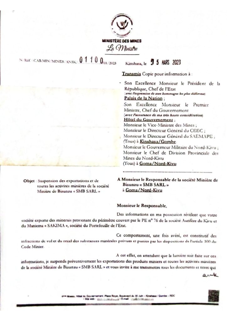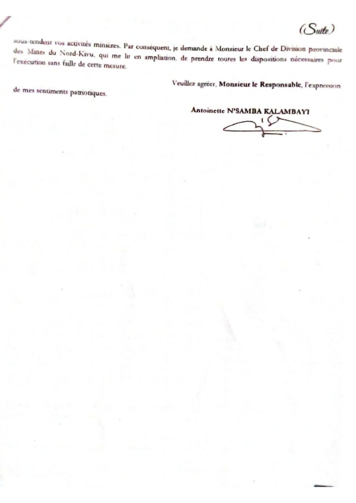 Selon cette lettre, Antoinette N’samba dit motiver sa décision par le fait que cette société a exporté des minerais provenant du périmètre de la Société aurifère du Kivu et du Maniema (SAKIMA), une entreprise publique.