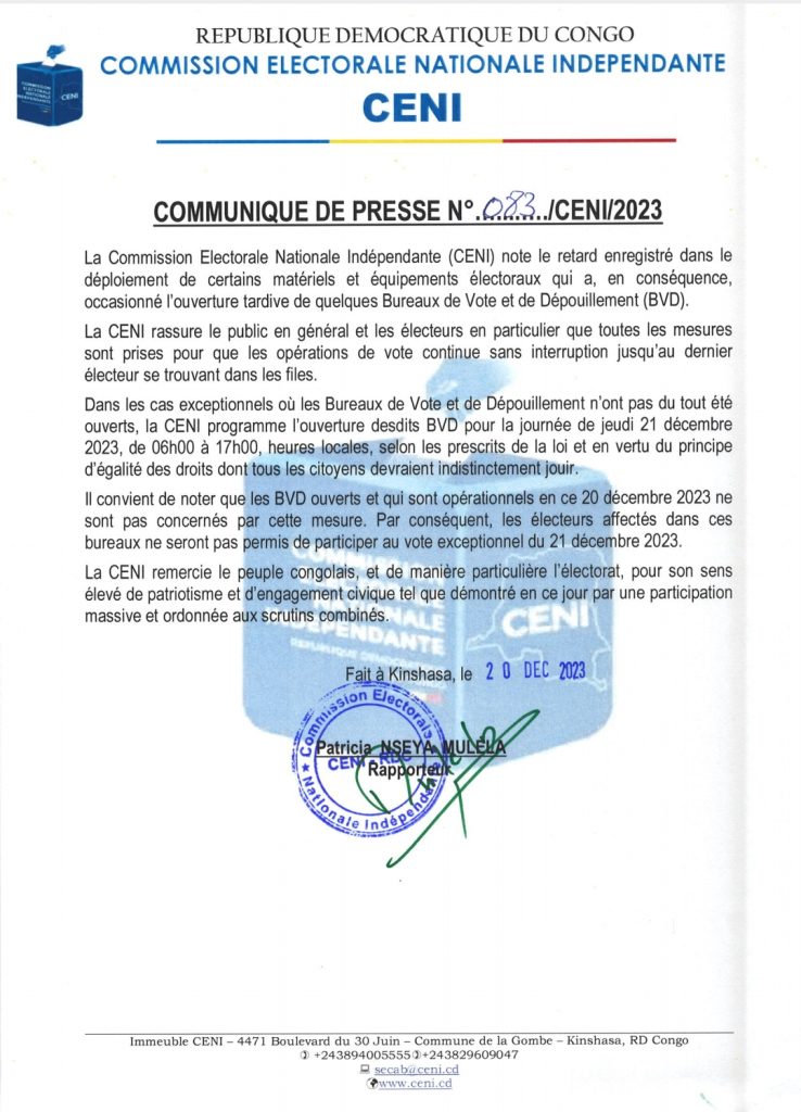 Les bureaux de vote et de dépouillement qui n’ont pas pu ouvrir leurs portes ce mercredi 20 décembre vont fonctionner ce jeudi 21 décembre de 06h à 17h pour permettre aux congolais de voter massivement.