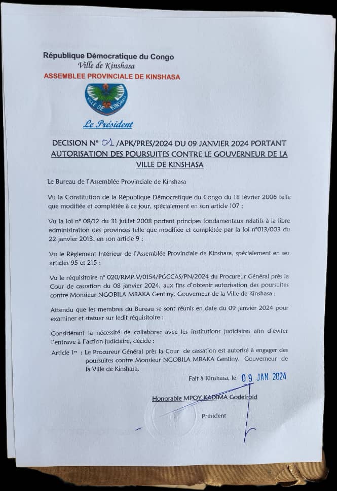 À la demande du procureur général près la Cour de Cassation, le bureau de l’Assemblée provinciale de Kinshasa a décidé, ce mardi 9 janvier 2024, de lever les immunités parlementaires de Gentiny Ngobila,  gouverneur de la ville.