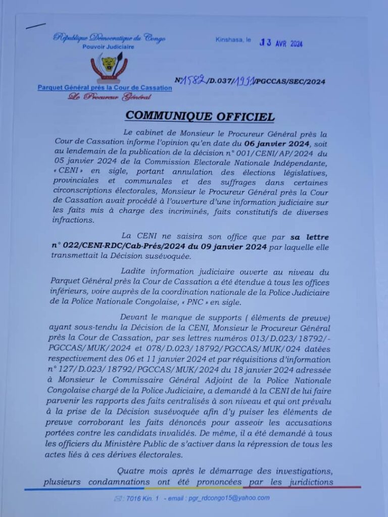 Ladite information judiciaire ouverte au niveau du parquet général près la Cour de cassation a été étendue à tous les offices inférieurs, voire auprès de la coordination nationale de la Police Nationale Congolaise ( PNC).