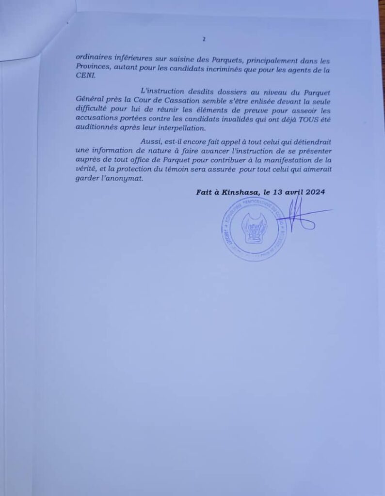 Informé des faits, le parquet général près la Cour de Cassation avait ouvert une information judiciaire sur le dossier le 6 janvier. La CENI l’a saisi officiellement sur ce dossier par sa lettre du 9 janvier 2024 où elle lui a transmis sa décision du 5 janvier.