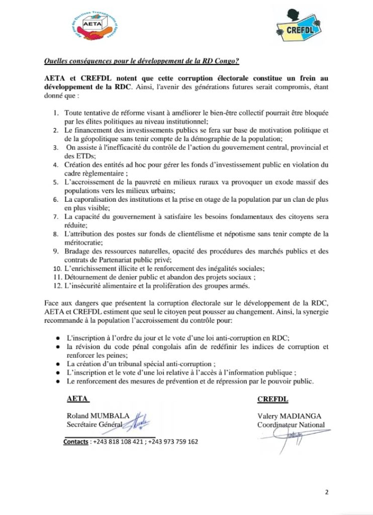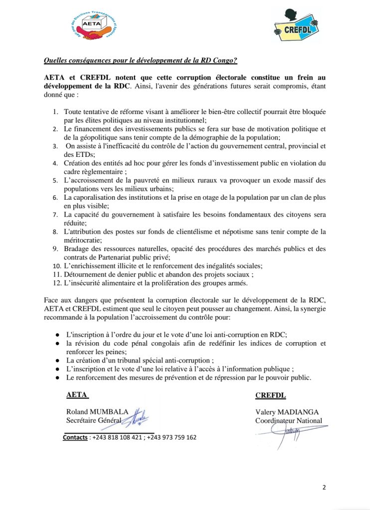 Pour l’AETA et CREFDL, cette corruption électorale constitue un véritable frein au développement de la RDC. L’avenir des générations futures sera compromis étant donné que toute tentative de réforme visant à améliorer le bien-être collectif pourrait être bloqué par les élites politiques au niveau institutionnel.