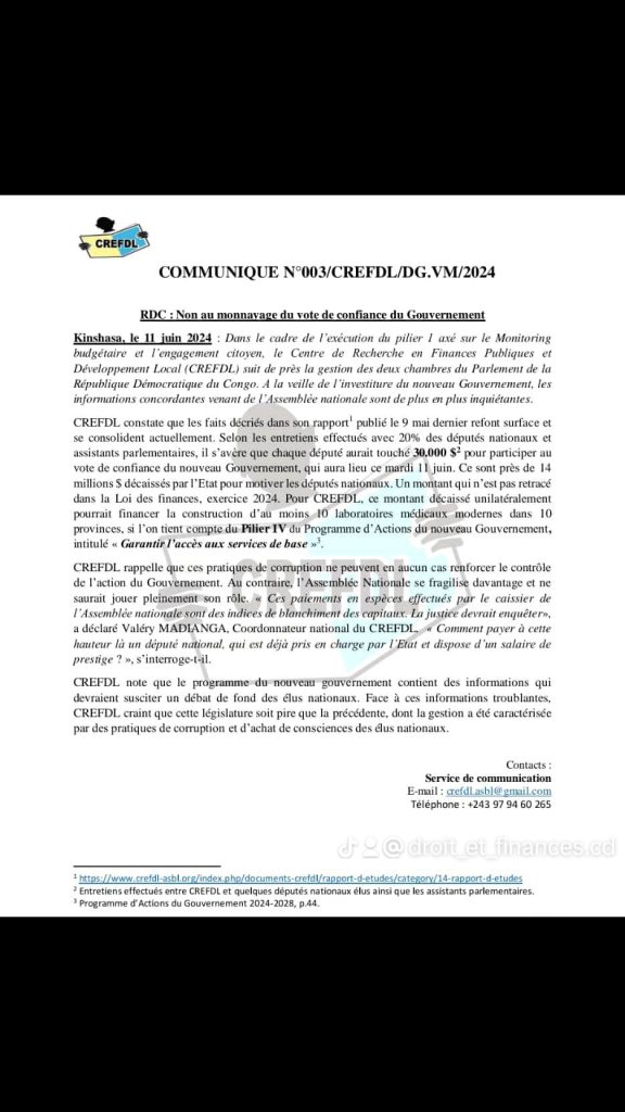Le gouvernement de Judith Suminwa sera investi ce mardi 11 juin 2024 par l’Assemblée nationale. Ainsi, le Centre de Recherche en Finances Publiques et Développement ( CREFDL) a mené une petite enquête sur les allégations de corruption qui circulent autour de cette plénière.