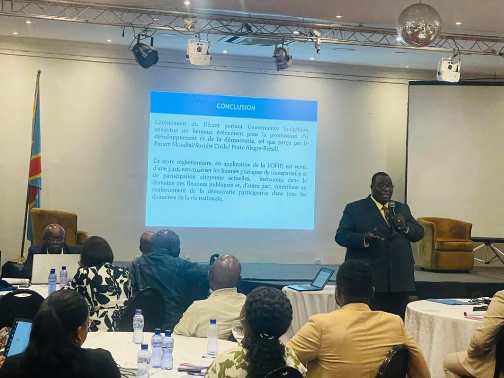La dernière intervention du premier jour de cet atelier a été celle de Georges Tshionza Mata, expert à COREF. Il a parlé du décret portant gouvernance budgétaire et de la participation citoyenne dans la gouvernance d3s finances publiques.