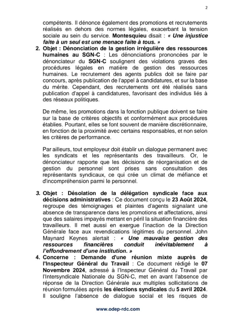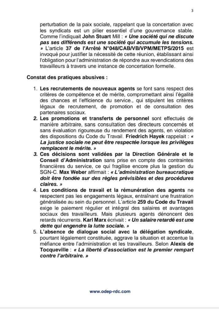 “À travers ces correspondances, les représentants syndicaux interpellent directement le Directeur Général du SGN-C et sollicitent l’implication personnelle de Son Excellence Monsieur le Ministre des Mines afin que des mesures urgentes soient prises dans l’intérêt général. Selon ces documents, le processus de recrutement, de promotion et d’affectation des agents au sein du SGN-C présente de graves irrégularités, compromettant la transparence et l’équité au sein de l’institution. De plus, les éléments évoqués pointent une mauvaise gestion des fonds publics, soulevant ainsi des préoccupations majeures quant à