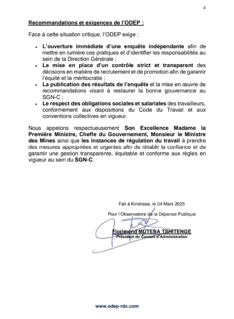 Face à ces allégations, l’Observatoire de la Dépense Publique invite les autorités du SGN-C à s’expliquer sur ces pratiques dénoncées et à apporter un éclairage à la population.