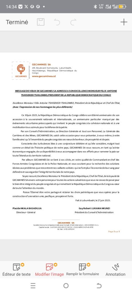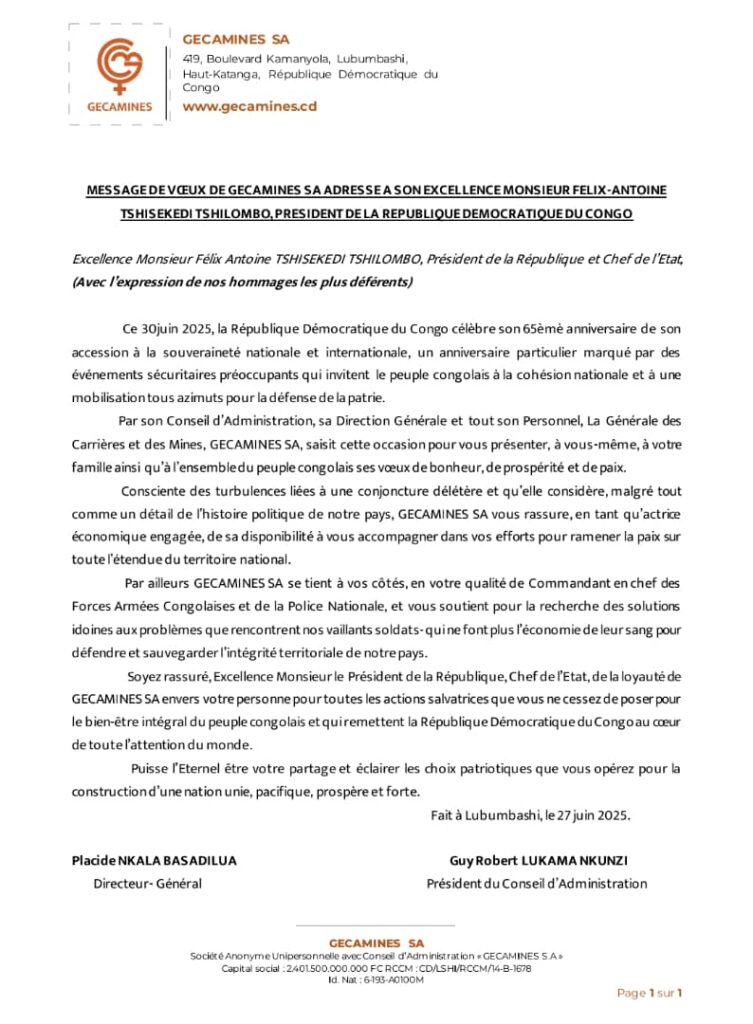 “Par son Conseil d’Administration, sa Direction Générale et tout son Personnel, la Générale des Carrières et des Mines, GECAMINES SA, saisit cette occasion pour vous présenter, à vous-même, à votre famille, ainsi qu’à l’ensemble du peuple congolais, ses vœux de bonheur, de prospérité et de paix”, lit-on dans le document.