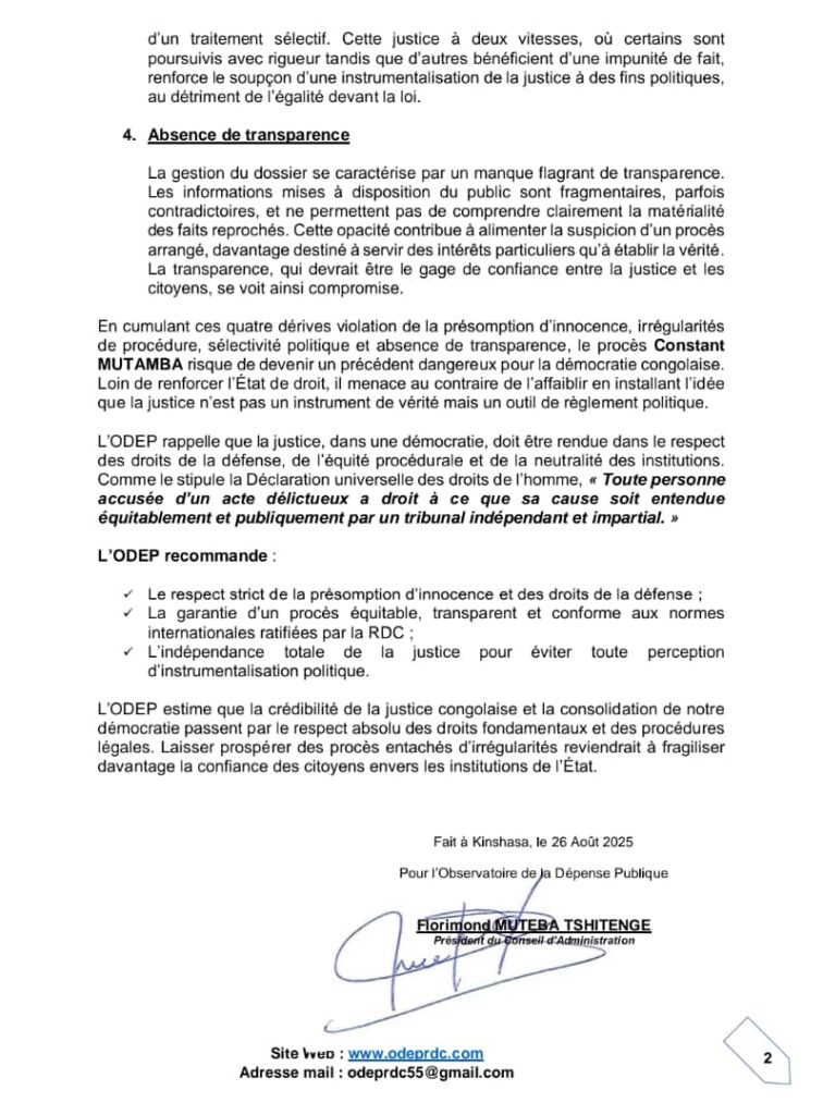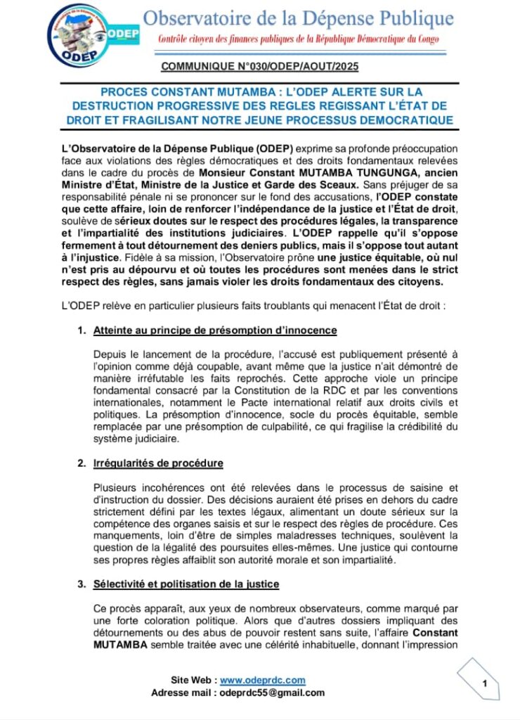L’Observatoire de la Dépense Publique (ODEP) a exprimé, dans un communiqué rendu public le 26 août 2025, sa vive préoccupation face au déroulement du procès de Constant Mutamba Tungunga, ancien ministre d’État et ministre de la Justice.