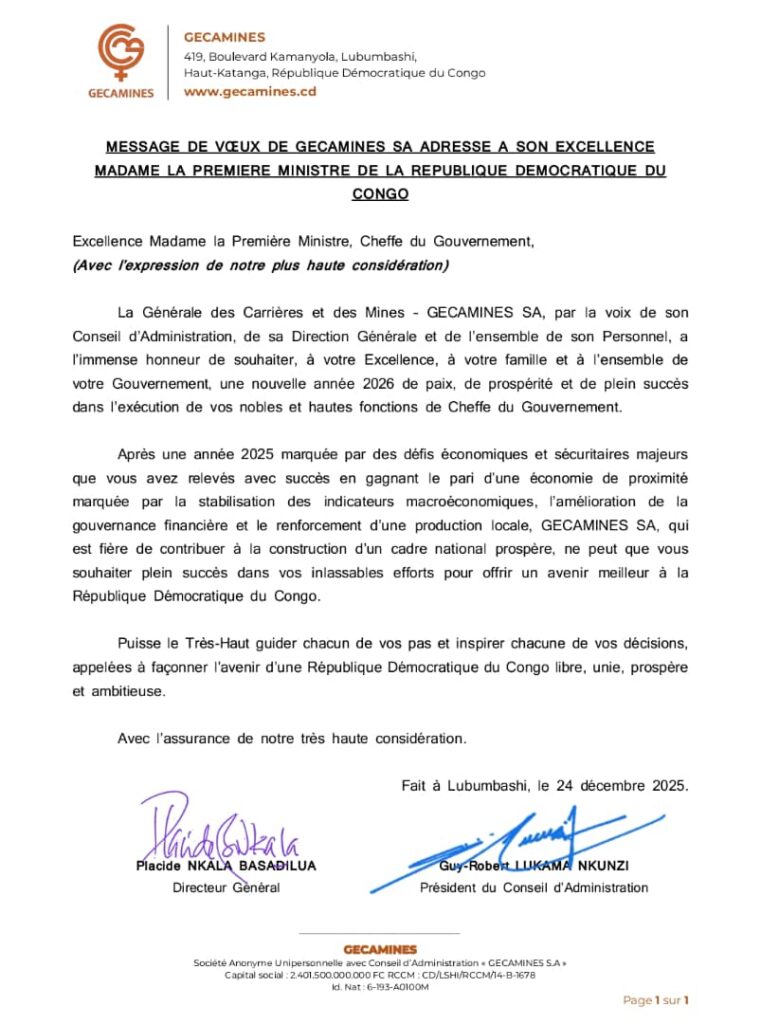 A l’occasion de la nouvelle année 2026, la Générale des Carrières et des Mines (GECAMINES SA) a adressé un message solennel de vœux à Son Excellence Madame la Première Ministre, Cheffe du Gouvernement de la République Démocratique du Congo, saluant son leadership et les avancées réalisées sous sa conduite.